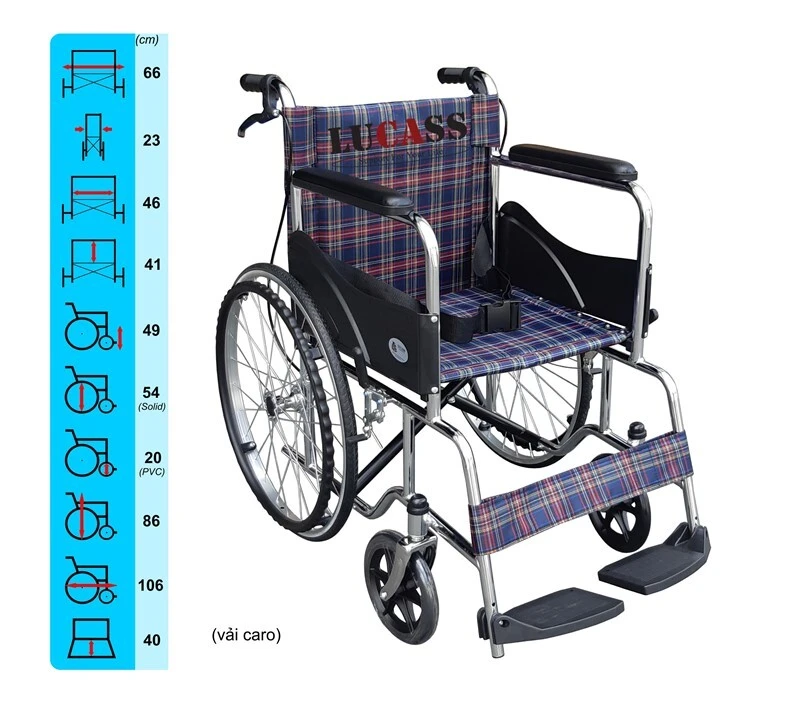 Phần ghế xe lăn và tựa lưng được làm bằng vải cotton Caro thoáng mát, dễ dàng vệ sinh, khi ngồi rấ dễ chịu.